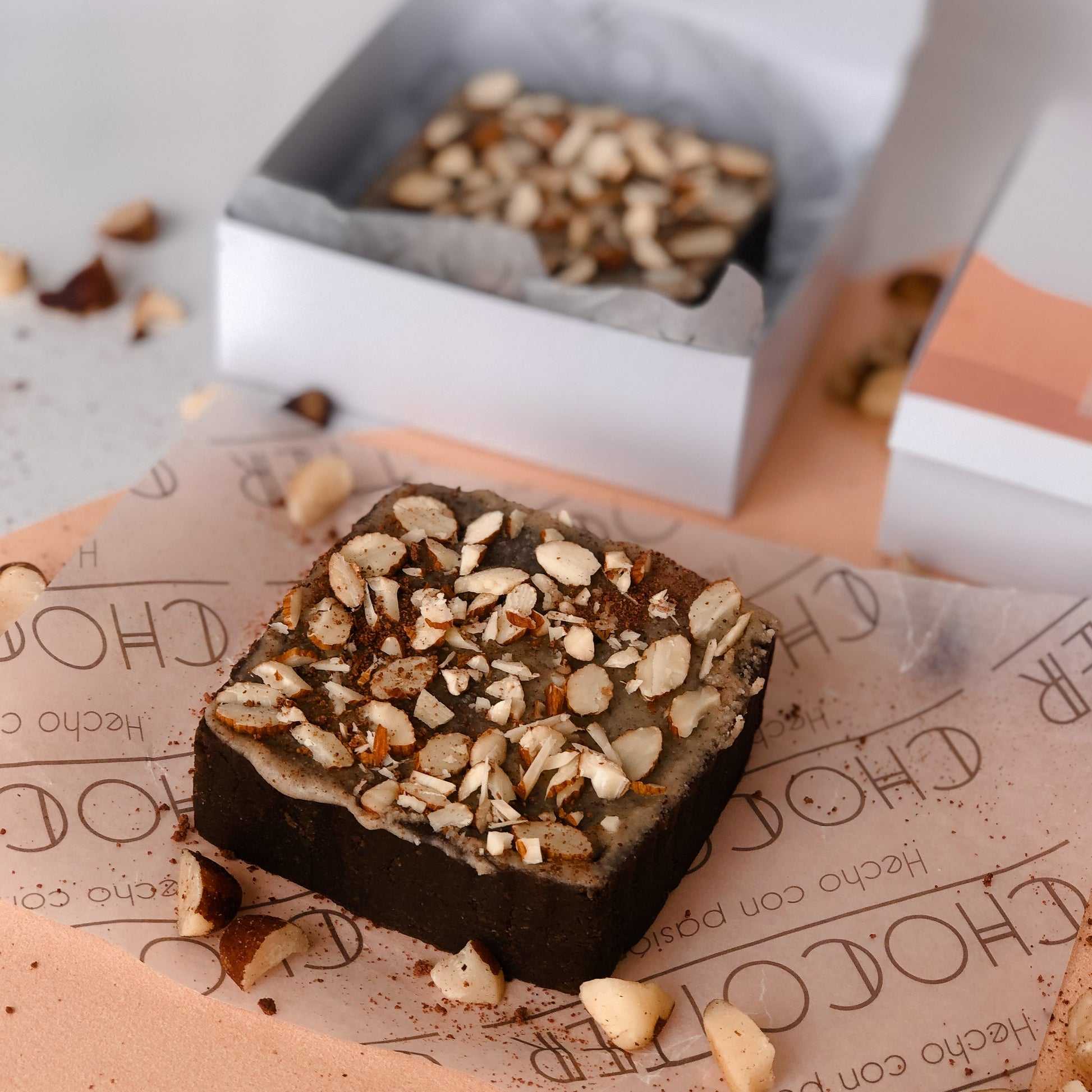 🧡 Hecho con harina de avena, cacao 80%, aceite de coco, endulzado con panela. Libre de lácteos e ingredientes artificiales, coronado con una capa de crema, almendras fileteadas y cacao espolvoreado.