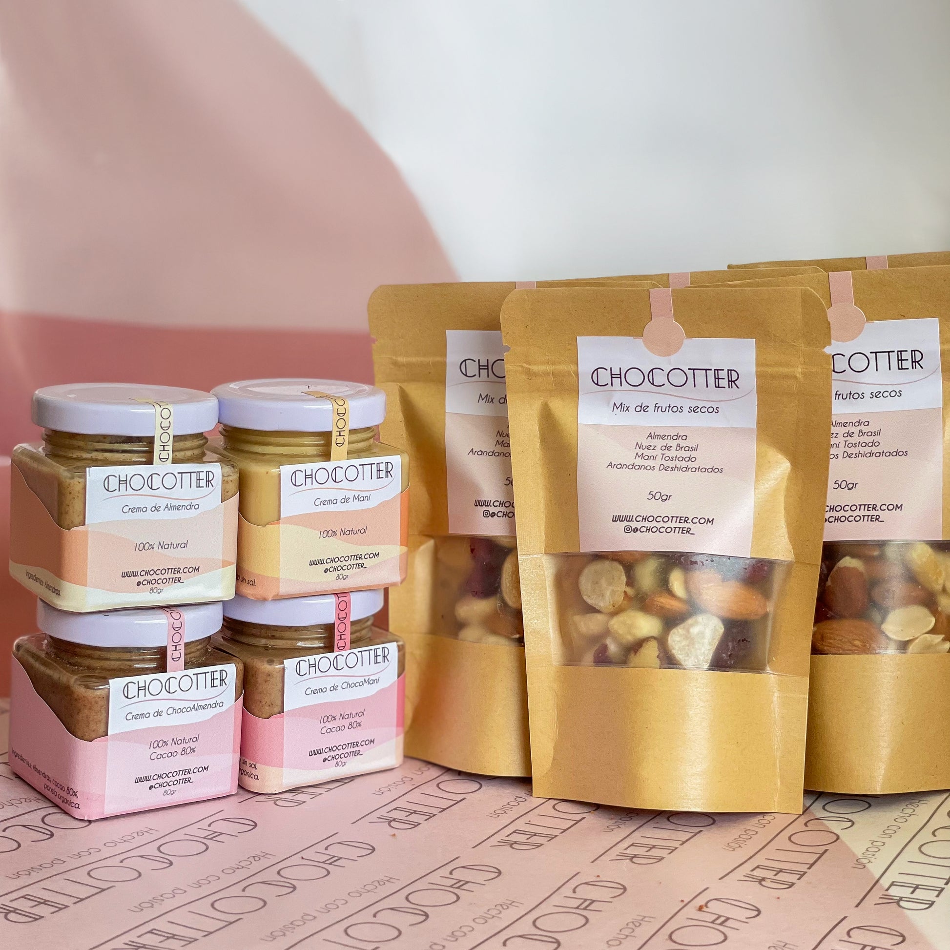 Incluye 4 mini cremas de frutos secos de 80 g (maní, almendras, chocomaní y chocoalmendras) y 5 mix de frutos secos de 50 g con la mezcla perfecta de energía y sabor.