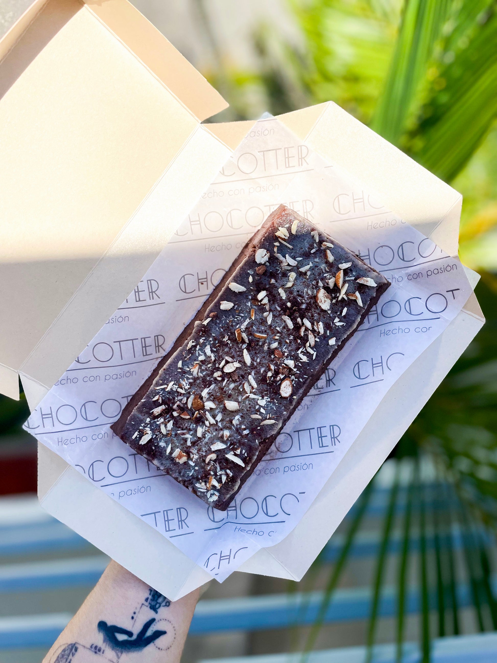 🧡 Hecho con harina de avena, cacao 80%, aceite de coco, endulzado con panela. Libre de lácteos e ingredientes artificiales, coronado con una capa de crema, almendras fileteadas y cacao espolvoreado.